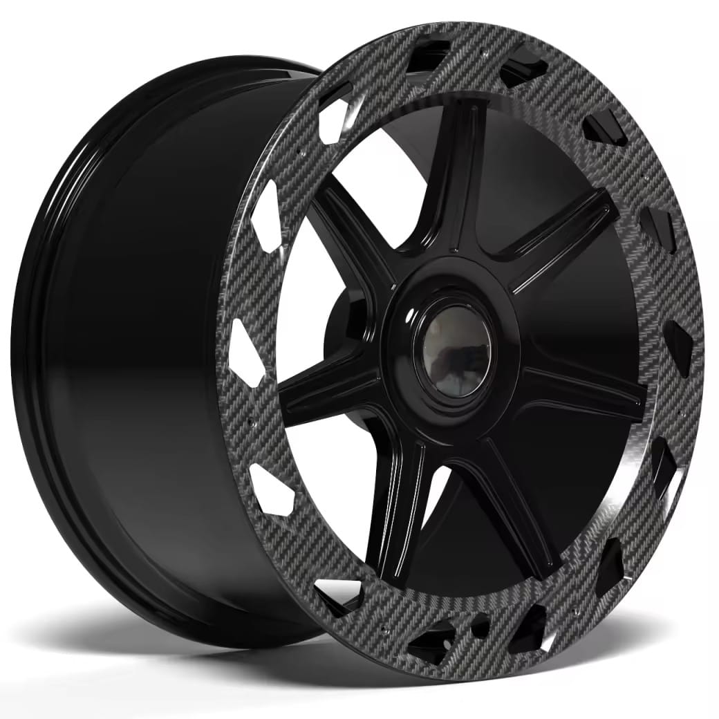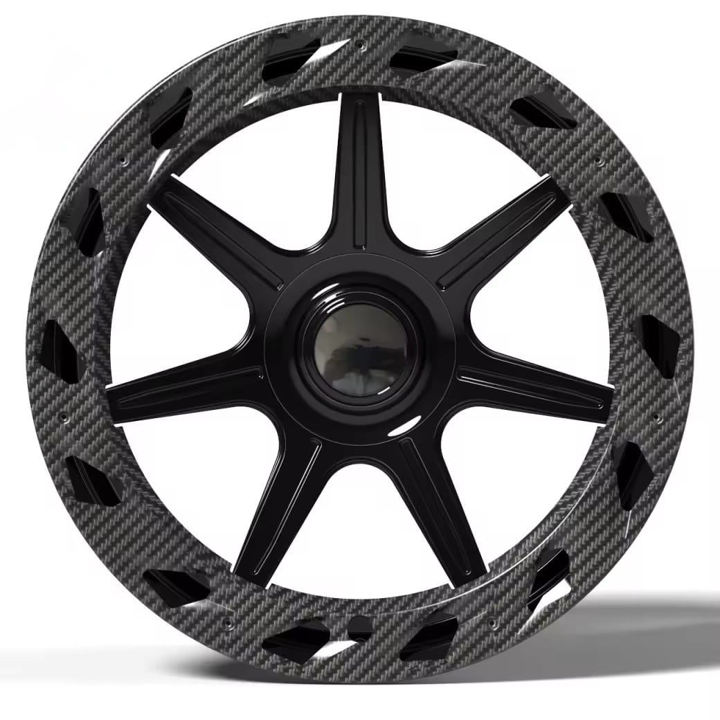 BA Vortex-X - Carbon Aero Series Simplicity meets innovation. This sleek 7-spoke wheel is enhanced with a lightweight carbon fiber aero disc, delivering both style and aerodynamic performance. The minimalistic spoke layout is perfect for a clean, motorsport-inspired look.