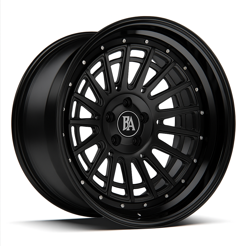 The BA Dominion is the definition of classic motorsport design refined for modern street presence. Featuring a deep-dish profile, riveted outer lip, and dense twin-spoke mesh pattern—all wrapped in a stealth satin black finish—the Dominion exudes vintage racing DNA with an aggressive urban twist.