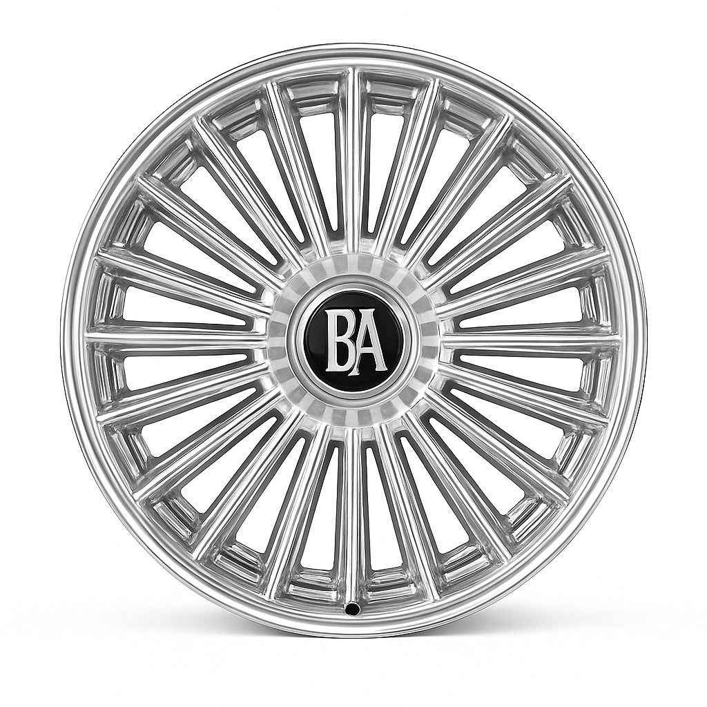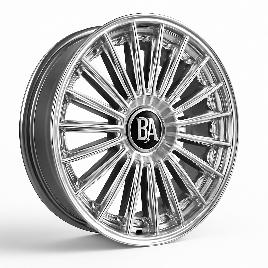 The BA Sovereign redefines elegance and complexity with its stunning full-face mesh design. Precision-cut spokes radiate symmetrically from the centre, showcasing a polished chrome finish that reflects light with every angle.